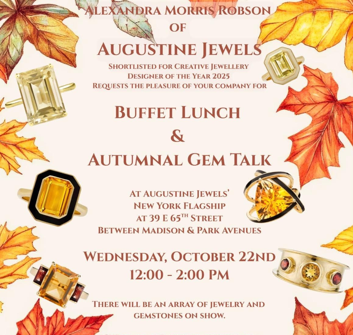 I wake up to a new day. I’ve been summoned back to jury duty but don’t have to be there til the afternoon, which means I can attend a lunch at Augustine Jewels on the Upper East Side. The owner, Alexandra Robson, is a friend of a friend, an excellent writer here on Substack: Vicky Ward Investigates