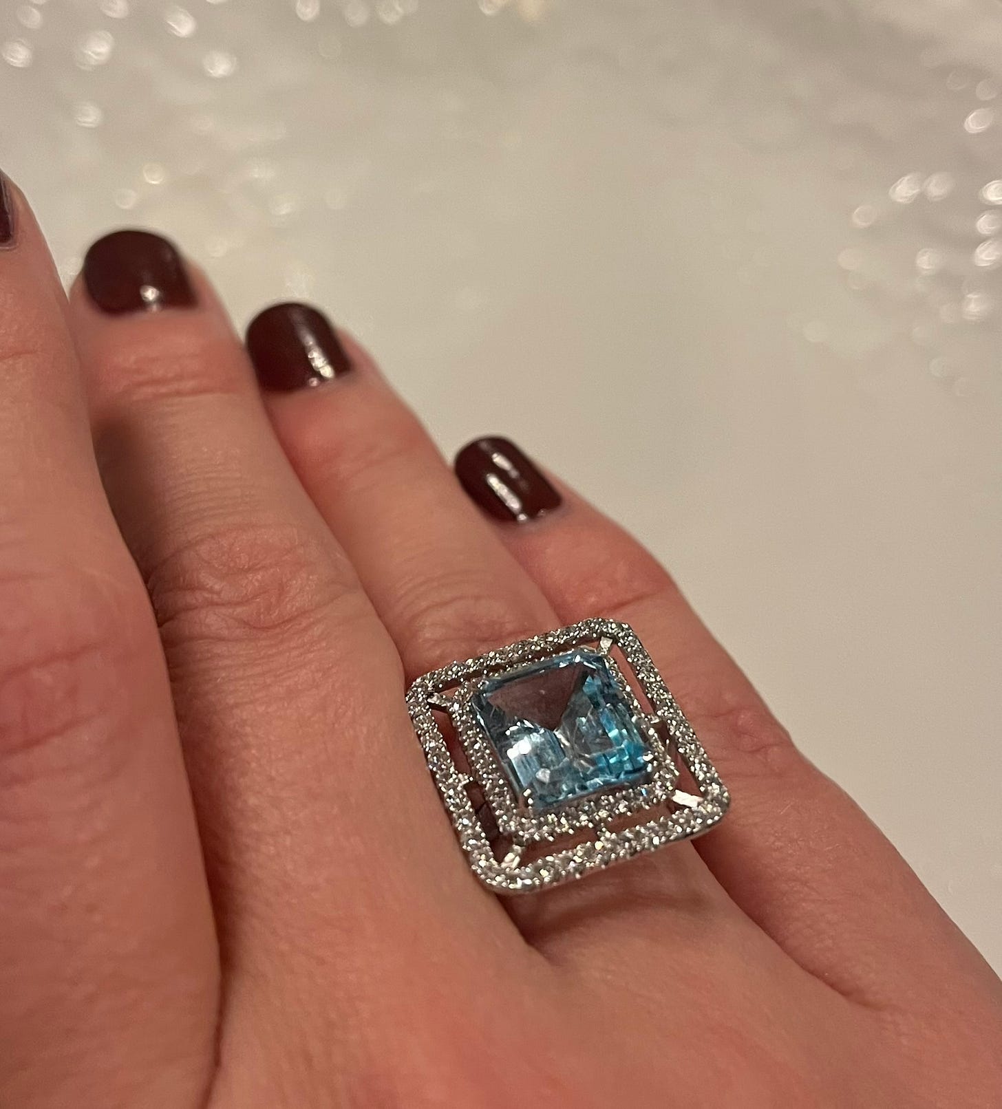 In hip-hop and pop culture, “ice” is a slang word for diamonds. I try on a stunning aquamarine and diamond ring, and imagine what it would be like to wear ice like this every day, as many of these ladies do. One of them, bedecked in a staggering set of emeralds—“All from my husband”—admires the aquamarine stone on my finger with a beguiling smile. “Do you know, I think that’s the only color of jewelry I don’t own!”