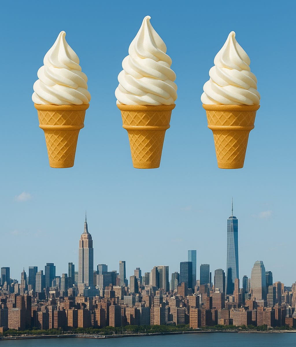 Manhattan Thrice is powerfully written and organized to expose the complex character of New York City from personal experience. The photos enhance each one. I loved the three vanilla ice cream cones floating above the cityscape.